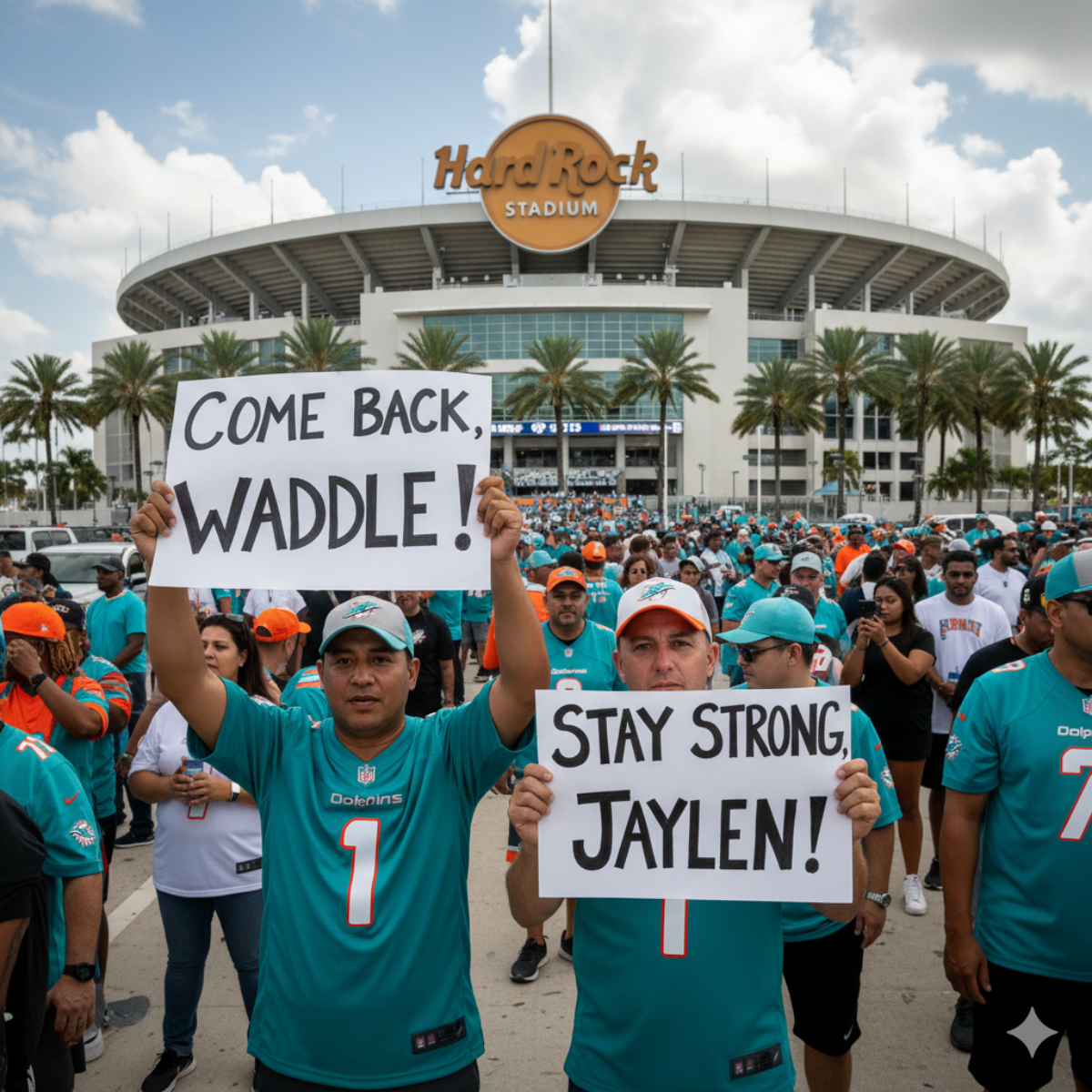 In the streets of Miami, camera crews swarmed Hard Rock Stadium hoping for a glimpse. Local media broadcasted images of fans holding signs reading “Come back, Waddle!” and “Stay strong, Jaylen!” The emotional connection between the player and the fanbase became apparent — and so did the fear of losing one of the team’s brightest stars.